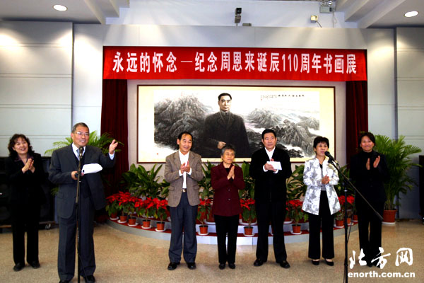北方網消息(記者馬宬):為緬懷周恩來同志的豐功偉績,弘揚老一輩無產階級革命家的崇高品德和優良作風,由周恩來鄧穎超研究中心主辦的《永遠的懷念——紀念周恩來同志誕辰110周年書畫展》於25日在周恩來鄧穎超紀念館開幕。市委常委、市委宣傳部部長肖懷遠出席開幕式並講話。全國政協原副秘書長趙煒,周恩來同志親屬代表,本市部分知名書畫家及本市各界群眾代表出席了開幕式。