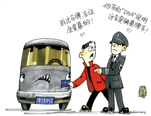 昨天10時,交警北辰支隊查驗交警在北倉道攔檢牌號為津AB95XX的灰色松花江車沒有年檢和保險標志,檢查牌照、行車證均沒有疑點,但查驗交警方連春、劉桂強、李克利憑借多年從事查驗的經驗,立即檢查車窗下VIN碼即人們俗稱的汽車DNA這一汽車身份證明,發現該車VIN碼有疑點,這輛手續齊全的松花江車為盜搶車。原來,車主劉某有一輛灰色松花江車,他低價購買了顏色、型號與自己松花江車相同的這輛沒有手續的松花江車後,謊稱牌照和行駛證丟失補領新牌照和行駛證,克隆的松花江車就這樣出爐了。但車主劉某沒有想到,他駕駛這輛牌照和行車證都是『真品』的克隆車第一天上路,就被北辰查驗交警通過檢查汽車VIN碼看出破綻查獲。據了解,截至昨天一年來,交警北辰支隊查驗交警還查獲266輛套牌車和180副假牌照,這些盜搶車多為低價賣到郊縣偏遠村鎮的夏利、松花江或長安車,村民因貪圖便宜購買而遭受了經濟損失。