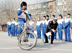 昨天上午11點,老師們在操場中央畫了一個大大的『8』字,旁邊還有一排用大塑料瓶擺好的『障礙』,一聲哨響,同學們先是騎著電動車繞著『8』的線路騎一圈,然後再環繞著塑料瓶以『S』曲線行駛。考核結束後,全校共有70%騎電動車的學生拿到了『安全許可證』,沒有達標的學生還要接受下一階段的考核。南開支隊南馬路大隊的張金龍警官負責監考,他告訴記者,行駛速度快、拐彎超車過猛、注意力不集中都是中學生騎電動車的常見弊病。