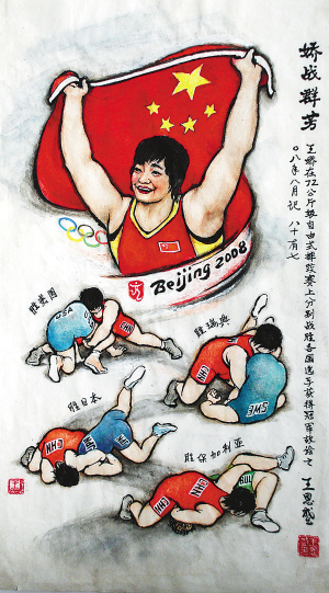 最近,王大爺剛剛完成了反映摔跤奧運冠軍王嬌力克美國、瑞典、保加利亞等國選手拿到冠軍的『嬌戰群芳』,它將成為馬上要出刊的天津美術館館刊的封面。