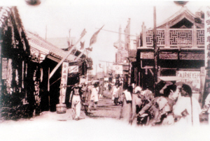 清末,天津已發展成為中國最大的商業都市之一,沿南運河、海河一帶形成繁華的商業區。圖右側有中藥店堂『遵古炮制咀片應癥丸散膏丹』招牌。