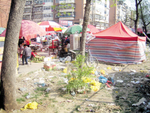 昨日下午,記者在劉先生的帶領下來到大直沽後臺西路。此時,道路上已經滿是佔路經營的商販,賣糧食的、賣日用品的、賣燒雞的,儼然成為一個農貿市場。在後臺10號樓附近,一名賣燒雞的商販乾脆將棚子搭建在了草坪上,佔據了約10平方米的草坪。這還不算什麼,前方不遠處,竟有人在兩棵大樹上拉起繩子晾衣服。由於大直沽後臺西路形成了自發市場,許多商販還將廢塑料袋、垃圾等隨意丟在草坪上。