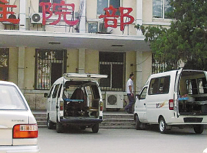 記者昨日在解放南路與圍堤道交口處的天津醫院院內看到,住院部門口凌亂地停放著八九輛『黑救護車』,這些車主要是由體型較小的面包車改裝而成,車廂內後排的座位大多被拆除,一側裝有一副擔架。