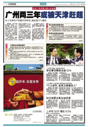 廣州市委書記朱小丹恐怕沒有想到,他在市委全會上關於“天津或趕超廣州”的言論,經當地媒體和本報報道後,會在津穗兩地引起廣泛熱議。自8月1日本報刊發《津穗面臨“第三城”之爭?》一文後,《新快報》等廣州媒體立即做出迴應,羊城的專家學者再次對“天津超廣州”的問題做出分析。與此同時,在互聯網上,一場關於天津與廣州的“第三城”之爭迅速在兩地網友間傳播。新浪網的相關專題上,有兩千多網友對此發表了看法。