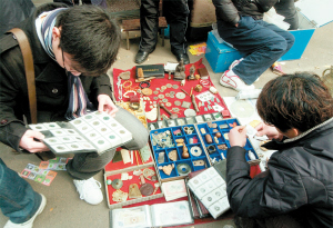 週四的時候,有不少攤子甚至擺到了店鋪門口的臺階上,只差一步就進了別人的地盤兒。但店鋪的主人們很少說什麼,因爲不少人也是擺攤起家。況且,攤位和店鋪是互補的,想淘貨也好,想尋高級玩意也罷,都可以在兩者間來回流連。瀋陽道的草根氣質,讓人對它生出親近之心。而對於古玩這種需要把摸鑑賞的行當來說,消除距離感無疑是至關重要的。