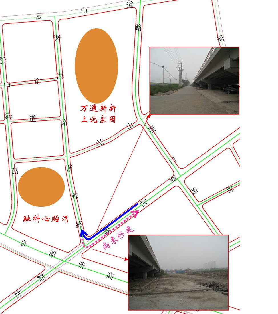 根據《濱海新區區綜合交通規劃2008-2020》的研究成果,諧海路位於融科心貽灣東側、萬通新新上北家園西側,向南連接新北路立交橋橋下輔路(連接處位於新北路立交橋東側),通過新北路聯通塘沽老城區與開發區。經過我局現場調查,如附圖所示:目前諧海路僅與新北路橋下北側輔路連接,該輔路為由東向西單行道路(單車道);而新北路橋下由西向東輔路尚未建設完成,因此造成融科心貽灣地區居民向南出行不便。我局已向天津市公路管理局塘沽分局建議,修建新北路立交橋下由西向東輔路,實現新北路與諧海路雙向連接,以方便融科心貽灣區域居民向南出行。