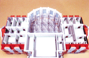此次施工首先對二樓大廳等薄弱環節採用輕型桁架加固增加整體性、提高空間剛度,對拱券部分進行磚砌封堵。其次製作了下滑軌道,其中北南向11組,東西向8組。下滑軌道採用條形混凝土基礎,其中跨地鐵通道部分採用筏板式基礎。然後對房屋進行託換施工,採用夾牆樑和擡牆樑等方式將房屋託換至托盤樑繫上。最後進行牆體切割,將房屋的荷載轉換至下滑樑上。記者王月