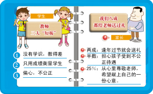 日前,本報聯合新浪網面向學生和家長進行了“你心中的好老師什麼樣?”的獨家調查,參與投票網友超過3000人。近三成學生認爲“老師對自己人生的影響最大”,卻有近六成學生認爲“老師不太負責任”;在近七成家長看來,“孩子學習不好,責任在老師”,而近八成家長承認“給老師送過禮”,主要“擔心孩子受到不公正待遇。”