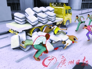 | 車上的水泥側翻,坐在上面的工友被水泥包壓住。 |