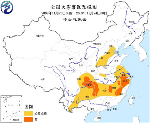 中央氣象臺23日06時繼續發佈大霧預報:
