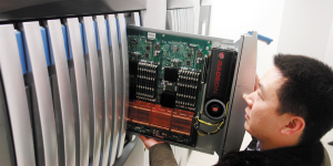 昨日下午,記者在位於開發區服務外包產業園內的國家超級計算天津中心看到,先期到達的首批設備已經安置到了一樓的一間機房內。與普通機房不同,該房間完全按照高標准要求裝修,每塊地板不僅可以揭起,而且距離地面大約40厘米,地板下的空間布滿了各種線纜。據悉,首批抵達的設備包括8個機櫃和128個計算模塊以及相關部件,可以組裝成為具有百萬億次計算能力的計算機系統。其中8個機櫃裡除了主機櫃外,還有存儲機櫃、監控機櫃以及通訊機櫃。