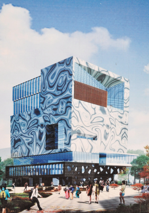 擊劍排球館近乎是正方體的建築,外形非常時尚。用項目負責人李仕鵬的話說,這還是他遇見的第一個用金屬鋁板做幕牆的建築,在上面營造水墨畫的效果,使得整個建築充滿動感和靈氣。在施工工地上,地上6層地下1層的建築被牢牢地包裹在綠色的安全網內,看不出太多的面目,但圍牆上的效果圖已經為這個充滿奧運色彩的建築揭開了神秘面紗。