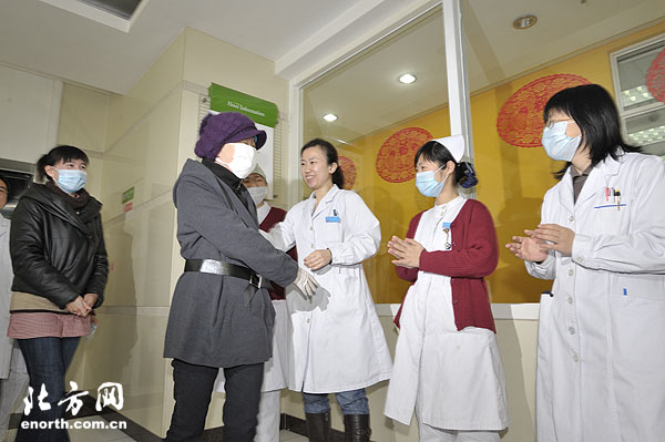 走出隔離病房的阿依努爾看上去精神狀態良好,有些激動。她向著周圍關心自己的人揮手致意,口罩後面是難掩的微笑。守候在隔離病房外的親屬回她以關切的笑容,而在普通病房外迎接她的醫生與護士則給了她祝賀的掌聲與擁抱。