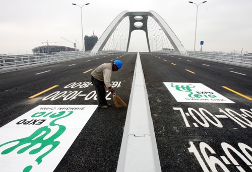 工人在浦東耀龍路的世博專用通道打掃衛生
