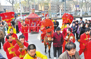 昨日下午,在南京路某酒店旁,本市一對新人舉辦了一場傳統中式婚禮。婚禮中新郎騎馬新娘坐轎,沒有使用一輛婚車,用既新奇又節儉的方式舉辦了這場『低碳』婚禮。市婚慶協會介紹,步入今春,越來越多市民以節儉新穎的方式舉辦婚禮。