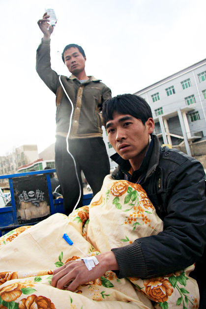 | 4月14日,受災群眾在室外空地上接受治療 |