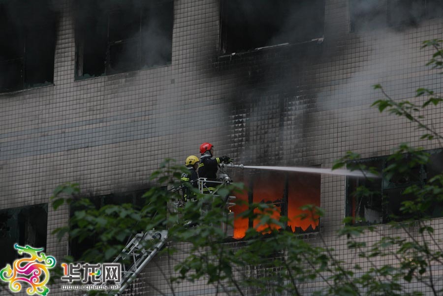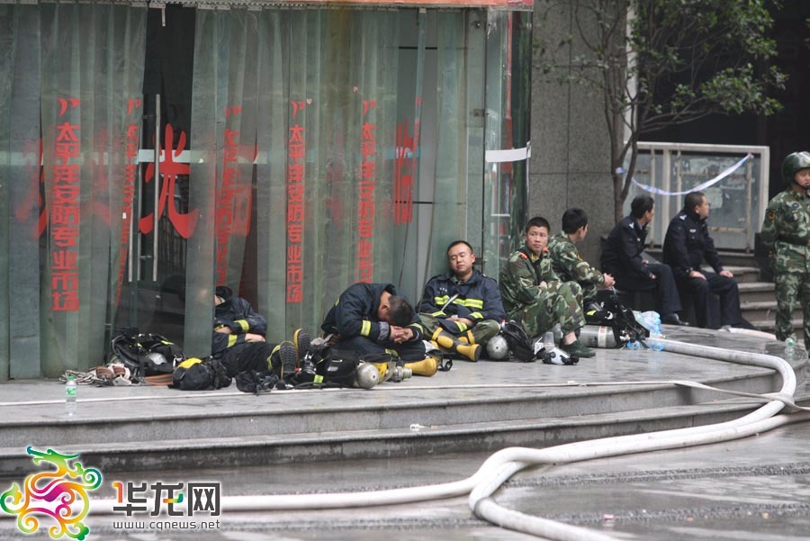 | 火災發生後,重慶市政府立即啟動突發事件應急預案。市委常委、常務副市長馬正其,市政協副主席、北部新區管委會主任吳家農率衛生、水電氣等部門第一時間趕到現場,成立現場指揮部,指揮滅火救援。要求各有關單位要全力以赴,在確保大樓群眾生命安全的基礎上,盡量減少火災損失。消防總隊出動15個中隊、42臺消防戰車、250餘名官兵,采取上下進攻、內外結合的滅火戰術實施撲救。公安民警、武警700餘人在現場疏散群眾、維持秩序。圖為消防車在現場滅火。 |