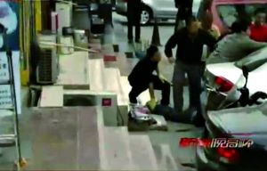 目擊者說,男子剛開始站在兩輛小汽車中間。在僵持過程中,他拖着小女孩一步步往“我愛我家”的店門口退去,直退到店門臺階旁的空調下。