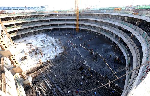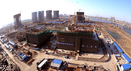 5月7日,工人在加緊建設響螺灣商務區奈倫國貿大廈項目工程。天津濱海新區『十大戰役』建設之一,總投資達420億元的響鑼灣商務區39個項目目前已全面開工,約1萬多名建設者在加緊施工。該商務區於2007年11月陸續開工建設,預計將於2011年底全部完工。