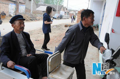 | 已經患半身不遂一年多的趙振裳(左)每天出入都需要別人推著(5月8日攝) |
