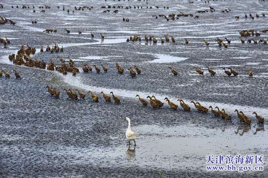 天津北方網消息:您見過海上養鴨子的事嗎?昨天,記者就在濱海新區漢沽營城鎮大神堂村的渤海岸邊目睹了海上牧鴨的真實場景。當潮水一點點漲起的時候,近4000只棕色鴨子順著海堤湧向灘涂,奔向大海,在海水淺灘中嬉戲覓食,場面十分壯觀。