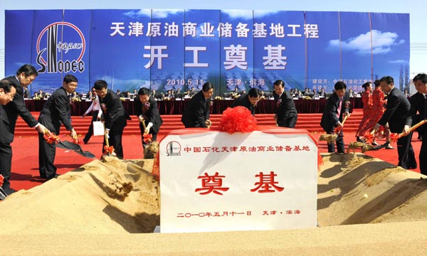 當日,根據國家能源戰略需求,中國石化天津原油商業儲備基地工程建設在濱海新區原油儲備基地舉行開工儀式。據介紹,該工程位於天津濱海新區南港工業區,基地工程將建成32座10萬立方米儲罐及配套設施。新華社記者劉海峰攝