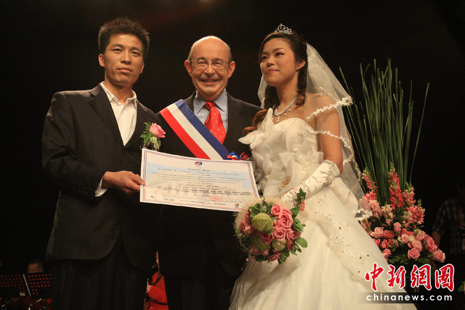 圖為法國圖爾市長為參與此婚典的新人頒發『證書』。