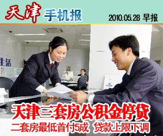 日前,天津調整個人住房公積金貸款政策,職工家庭貸款購買第三套及以上住房,暫停發放公積金貸款;貸款購買第二套住房,首付應不低於所購住房款的50%。該政策5月31日起施行,2015年5月30日廢止。