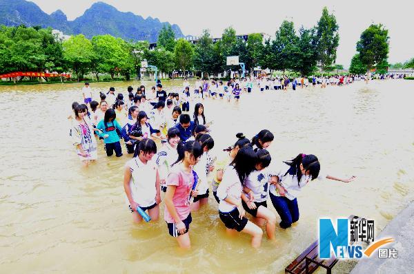 | 6月2日,幾位高三學生將備考資料拿回宿捨。 5月31日23時至6月1日,廣西都安瑤族自治縣遭遇特大暴雨襲擊,城區降雨量達329.4毫米,縣城澄江河水位暴漲,河水於6月2日早上湧進都安瑤族自治縣第二高中,校園一片『汪洋』。正在緊張備戰高考的1000多名師生相互幫助,積極克服不利因素,抓緊備考。目前學校已采取措施,密切關注水情,保證學生順利備考。 |