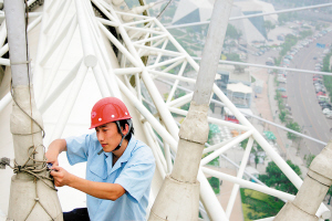 『我們平時要檢查很多項,每項都得很仔細。』站在只有一米寬的軸心上,吳師傅麻利地從工具箱裡拿出扳手,把安全繩系在軸上,開始檢查軸心的螺絲、滑環、驅動、轎廂等。『日檢、周檢、月檢我們都有,修的是什麼地方,怎麼修的都要記錄。』