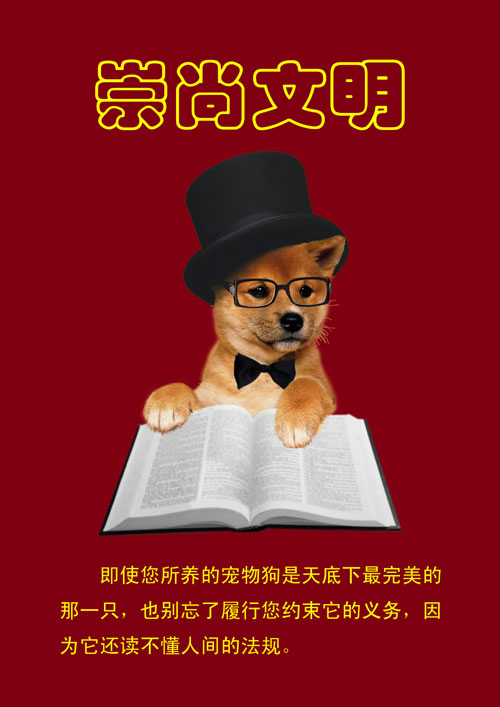 作品說明:首先,以一條盡享人間文明的小狗作為視覺中心以引起人們的注意。以此表明寵物狗已經越來越多地走進人們的生活,它在給人們帶來歡樂的同時,也給人們帶來了一系列的安全、衛生、擾民等問題。如果大家都站在各自的角度上,強調各自的好惡理由,那麼和諧社會裡的和諧生活就是一句空話。寵物狗的文明程度是以養狗人的文明程度為前提的。所以養狗的人首先要崇尚文明,這就點明了主題;其次,使用暗紅色的背景色增加了一些生活的熱烈氣息,以減少主體的凝重帶給人的壓抑感;再次,使用較為耀眼的明黃色和不過分嚴肅的字體標出主題文字,意在引起人們的關注,同時又給了大家一個較為溫和的命題,從而避免了直白的說教。最後,使用較多的文字、較莊重的字體,鄭重而又不失詼諧地提醒養有寵物狗的主人們,別忘了文明養狗,以倡導崇尚文明的社會風尚。