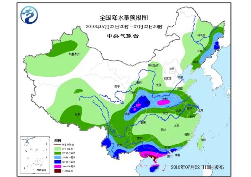 23日20時至24日20時,新疆西部和北部、西藏大部、青海南部、甘肅東部、陝西大部、內蒙古東北部、東北東部和西北部、山西中南部、河北西南部、黃淮中西部、江淮、江南、華南、西南地區等地有小到中雨或陣雨,其中,四川盆地大部、重慶中北部、陝西中南部、山西南部、河南大部、湖北中西部和北部、安徽西北部、山東西南部、雲南大部、廣西大部、廣東西南部、貴州西南部等地有大到暴雨,局地有大暴雨;上述地區局地並伴有短時雷雨大風等強對流天氣。新疆中東部、內蒙古西部等地有4~6級風。南海西北部海域、北部灣將有5?7級西南風