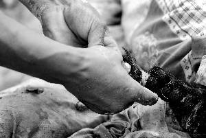 | 韓如棟為遇難的8歲女兒最後一次編辮子,其父母、妻子、女兒、弟妹等9人遇難或失蹤。 |