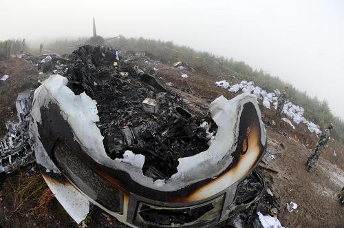 25日5時許,新華社記者分兩組從不同方向趕到伊春市,在事故現場目睹了慘烈的一幕:一架幾乎已經燃燒殆盡的客機斜臥在充滿積水和蒿草的砂石路上,經過燃燒的機身已斷裂成一段段『黑炭』,僅有機頭駕駛艙和尾翼還殘存著原來的面目。在失事地點方圓50米內,還能看到部分飛機殘骸,並能發現書本等雜物。