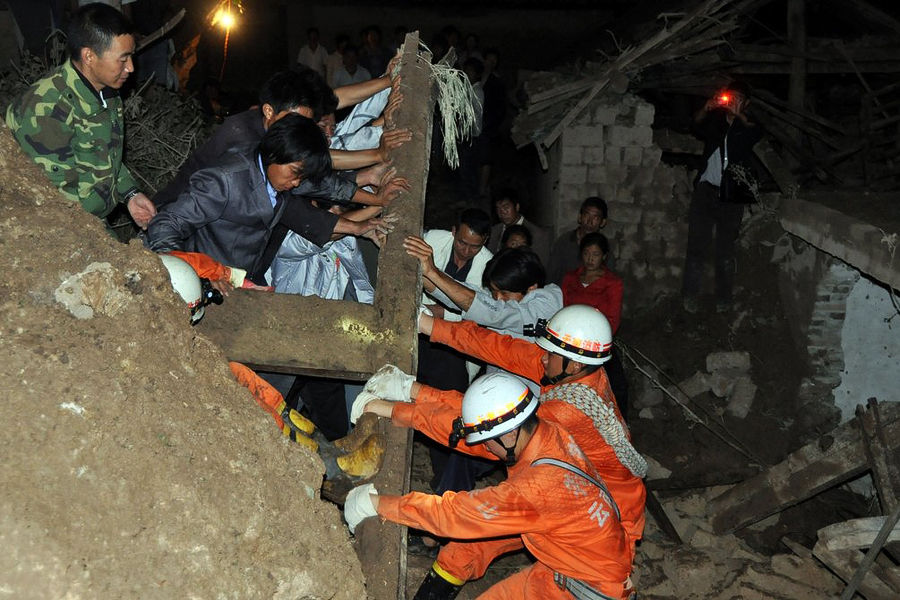 | 9月2日,雲南保山市隆陽區瓦馬鄉河東村山體滑坡現場,災民用手挖親人遺體。 |