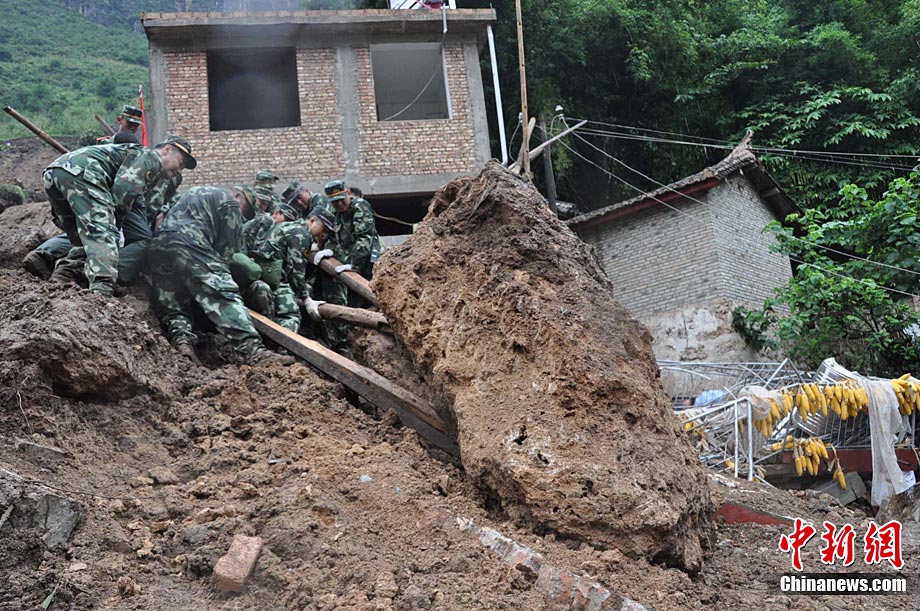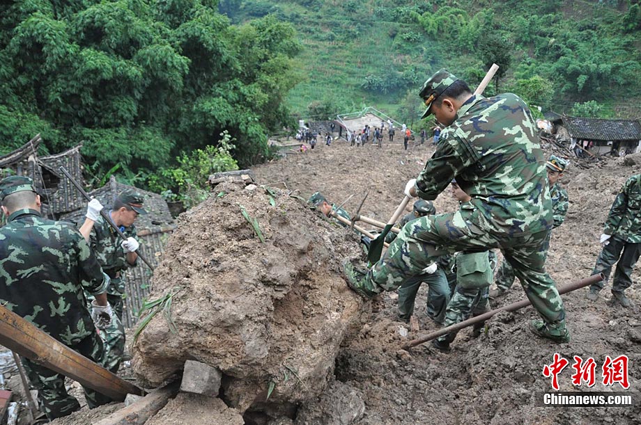| 9月2日,邊防官兵在雲南保山山體滑坡災害現場進行搜救。截止發稿時,9月1日晚發生的災害已造成4人死亡,44人失蹤。 |