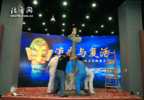 天津北方網訊:9月3日上午,已經安全抵津的三星堆、金沙遺址出土文物逐漸被揭開嚴密的包裝,顯露真容。四川廣漢三星堆博物館以及天津博物館的工作人員忙著清點文物,還有一些工作人員則搬運那些大型文物進入展廳。