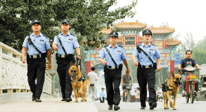 這兩個路段在地勢上比較靠近達沃斯論壇場館,而且這裡有具有代表性的體育場館,是國際賓客參觀的景點之一。因此,迎風道、凌賓路兩個路段被列為南開分局警犬偵訓隊巡控的第一巡區。在兩名訓導員的牽引下,兩只警犬精神飽滿地走上街頭。這兩只警犬在奧運會期間就曾多次在這裡守衛。來到體育中心旁,警犬相當熟練地與訓導員按照巡控路線前進。