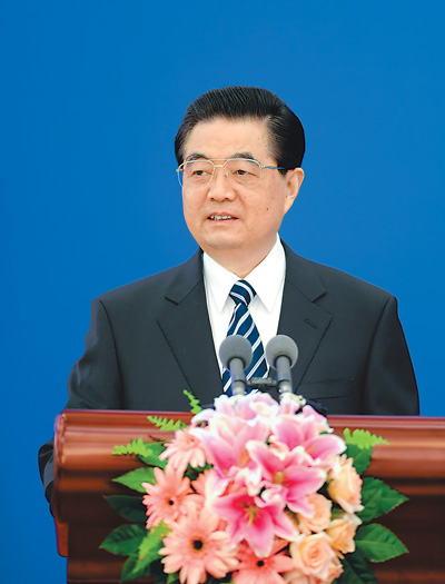 胡錦濤在講話中首先代表中國政府和人民,對會議的召開表示熱烈的祝賀,向與會各位代表表示誠摯的歡迎。