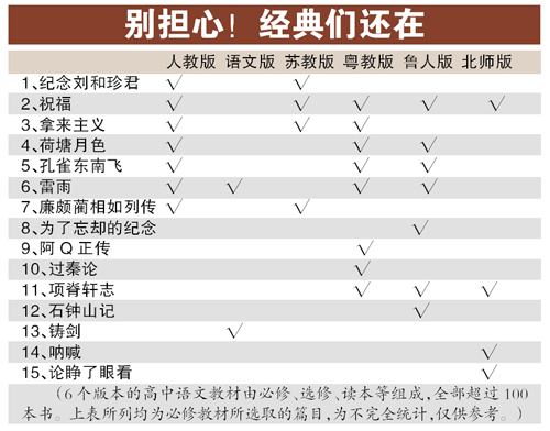 本報記者查閱6個版本高中教材發現全國各省陸續啟動『高中課改』,采用的新課標語文教材在結構和思路上變化較大,課文也作出相應調整。記者翻閱目前全國各地采用的6個版本高中語文教材目錄發現,絕大多數網上傳言被『刪除』的經典名篇依然在教材中。