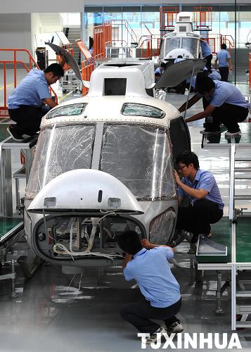 9月19日,中航直升機天津總裝線員工在總裝直升機。