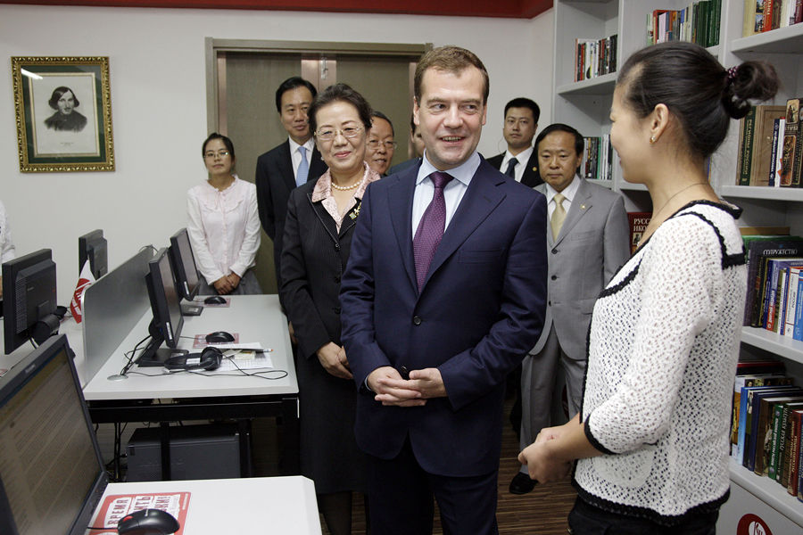 | 9月26日,俄羅斯總統梅德韋傑夫參觀大連外國語大學。 |