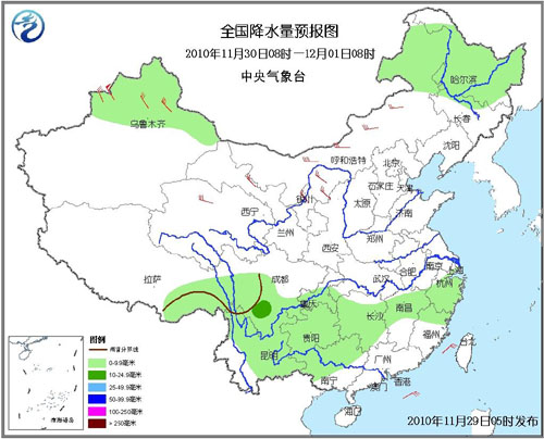 11月30日08時至12月1日08時,新疆北部、西藏東部、川西高原中南部、內蒙古東北部、黑龍江大部、吉林北部等地有小到中雪(雨)或雨夾雪,其中,新疆北部的部分地區有大雪;西南地區大部、廣西大部、江南北部等地有小到中雨或陣雨。新疆北部、西北地區中東部、內蒙古大部等地有4?6級風,新疆山口地區風力可達8?9級。新疆南疆盆地、內蒙古中西部等地有揚沙或沙塵天氣。東海南部海域將有5?6級旋轉風、局部海域風力可達7級;臺灣海峽、臺灣以南海域、南海北部和中部海域將有5?7級的東北風。