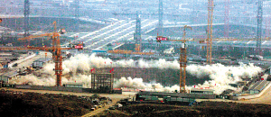 據了解,此次爆破共使用炸藥2噸,總計5000個爆破孔。由於支橕體系中的環梁截面積較大、箍筋密,采取了多排布孔的方式。起爆點由雙發雷管引爆,整個支橕爆破網路采用MS-5段毫秒延期雷管延期,圍檁爆破網路采用MS-3段毫秒延期雷管延期,整個爆破時間持續6秒。此次爆破總工程量達1800立方米,面積1萬平方米。