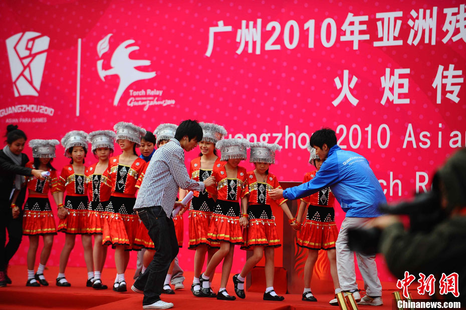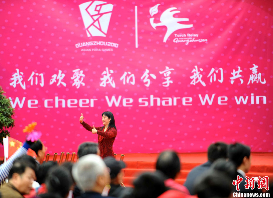 亞殘會廣州藝術博物院火炬傳遞活動12月7日上午舉行起跑儀式,儀式上解說員用手語向失聰觀眾進行解說。