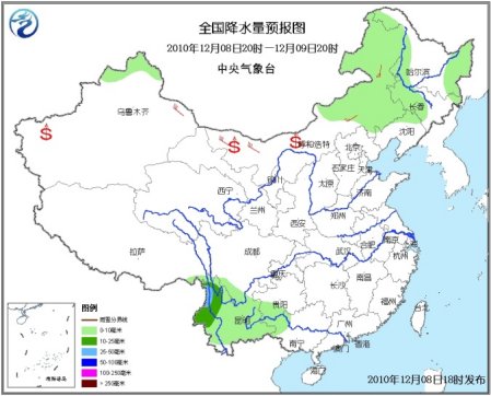 9日20時至10日20時,內蒙古中東部、東北地區大部、河北北部等地有小到中雪或陣雪,其中,內蒙古東部、黑龍江中南部、吉林大部、遼寧東北部等地的部分地區有大雪,局地有暴雪;西藏東南部、西南地區大部、湖北南部、江南中西部、廣西北部等地有小到中雨,其中,雲南西部局地有大雨。西北地區中東部、內蒙古大部、東北、華北等地有4?6級風。內蒙古西部的部分地區有揚沙,局部地區有沙塵暴。渤海、黃海北部和中部海域將有7?8級,陣風9級的西南風轉西北風。