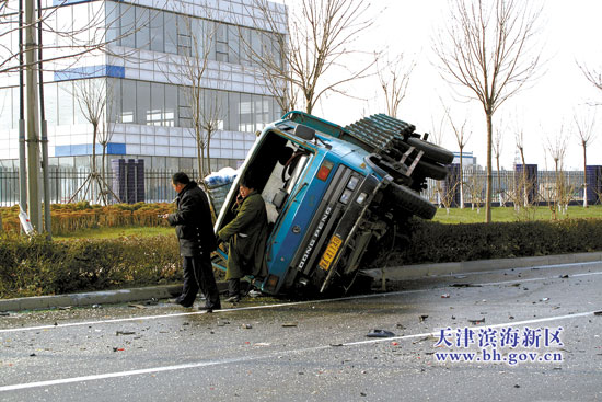 濕滑的路面對道路交通的影響更大,僅在河北路上,記者就連續看到兩起因道路濕滑剎車不及時造成的追尾事故。昨日上午11時左右,在開發區西區新業二街靠近新安路附近,一輛大貨車和一輛轎車為相互躲避,發生側滑事故。大貨車直接側翻在路邊,貨物灑落一地。小轎車一頭紮進綠化帶,車頭和車尾均受損嚴重,所幸沒有人員傷亡。據目擊者田先生介紹,由於路面濕滑,兩車滑出數十米遠。