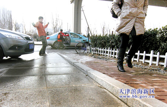 昨日早上8點,記者來到塘沽河北路和上海道、開發區第二大街和南海路等主要路段,當時部分路面和便道被一層薄冰覆蓋,道路濕滑。雖然走在路上的行人小心翼翼地挪動,但不時仍有人摔倒。路口拐彎處更是成了『高危路段』,騎車市民紛紛『落馬』。有市民表示:『這種路況太危險了,稍不留神就得摔跟頭。』
