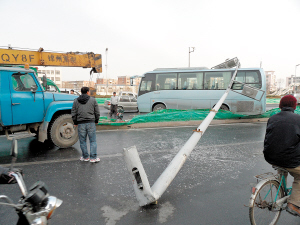 在昨天早晨的上班高峰中,通往濱海的津濱大道上,一輛班車因為路滑而出了事故。昨天早晨7:00左右,這輛班車行駛到津濱大道的東興立交橋附近時,輪胎突然打滑直接衝向了逆行車道,直到被路中間的花壇阻攔纔停了下來,但還是將路邊的一根路燈杆撞斷,隨後這根路燈杆又搭在了車身上。