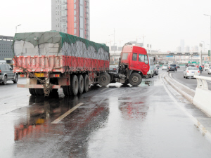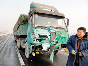 將這起事故處理完畢,同樣是在津濱大道上,一輛貨車在打滑後相繼跟一輛夏利車以及一輛貨車相撞,使得3輛車都損失嚴重。